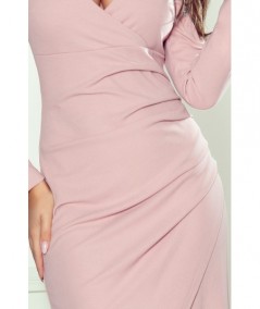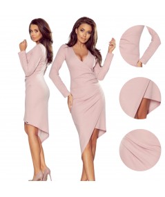 Asymetryczna sukienka w kolorze rózowym, z eleganckim dekoltem i drapowaniem, wykonana z matowego, lekko elastycznego materiału (95%...