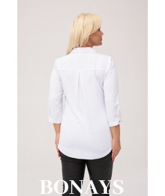 Góra bluzki zdobi kołnierz na stójce, a z przodu prezentuje się z metalowymi guzikami Sandra, dodając nutę elegancji. Dopasowane zaszewki na przodzie podkreślają kobiece kształty, podczas gdy karczek i kontrafałda z tyłu dodają subtelnego uroku. Zaokrąglony dół z łukami po bokach nadaje bluzce lekkości. Rękaw 7/8 z zakładką i guzikiem stanowi wyjątkowy detal.