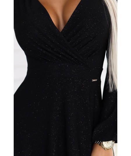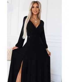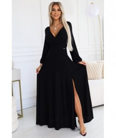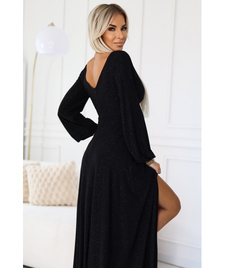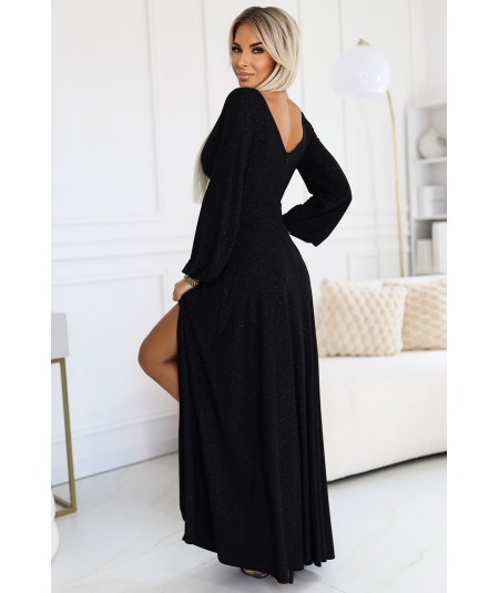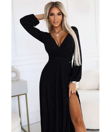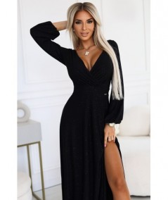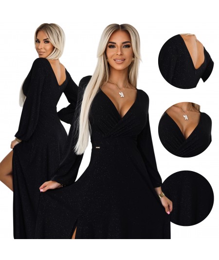 Nela – długa, elegancka suknia z dekoltem w kształcie litery V, rozcięciem na nogę i luźnymi długimi rękawami. Kolor: granatowy....