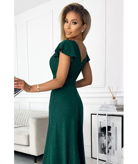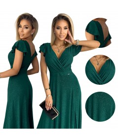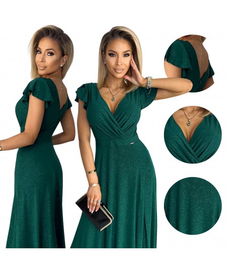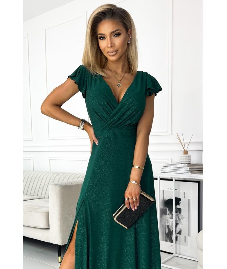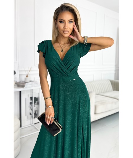 CRYSTAL to długa, błyszcząca suknia maxi w kolorze zieleni butelkowej z brokatem. Kopertowy dekolt i rozcięcie na nodze dodają...