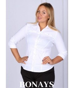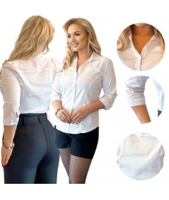 Gładka koszula damska o dopasowanym, lekko taliowanym fasonie. Koszula wykonana z bawełny z domieszką streczu, dzięki czemu idealnie dopasowuje się do ciała jednocześnie je opinając w taki sposób że je idealnie modeluje. Koszula o klasycznym wyglądzie i casualowym wyglądzie. Biała koszula z kołnierzykiem, zapinana na guziczki, model z rękawem do łokcia, wykończony mankietem i guziczkiem. Koszula doskonale nadaje się do noszenia wpuszczona w spodnie, ołówkowa spódniczkę i tego typu stylizacje. tyle karczek i cięcia stębnowane podwójnie.