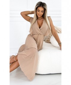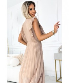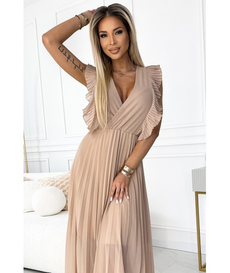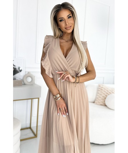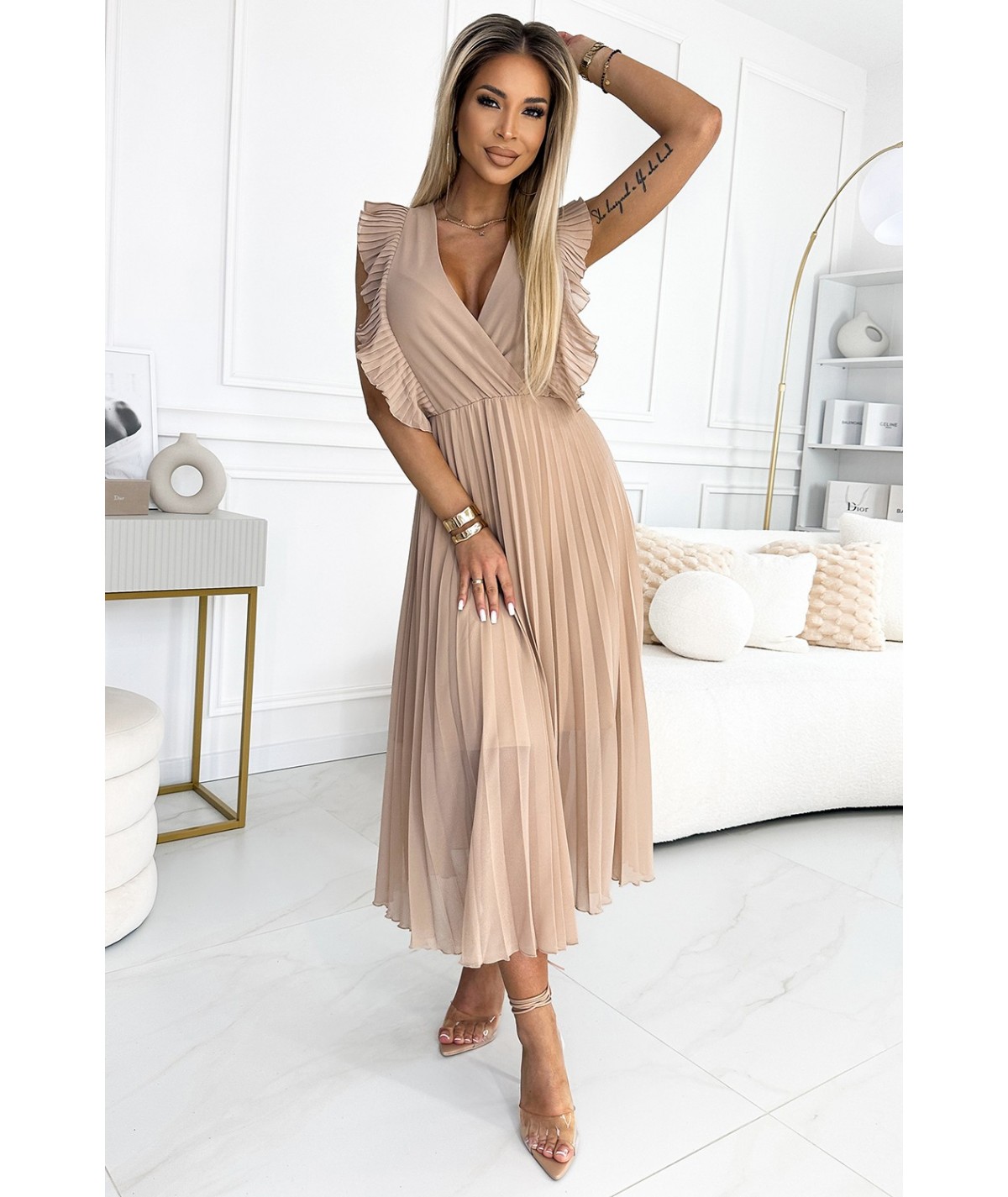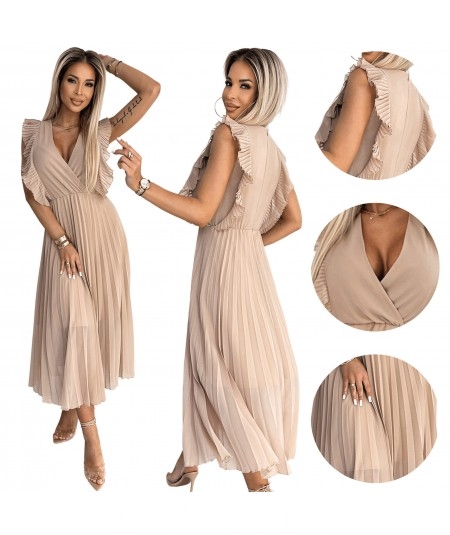 Emily - Plisowana sukienka MIDI z falbankami na ramionach i dekoltem beżowa