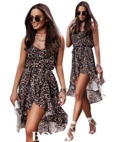 Szyfonowa, asymetryczna sukienka w panterkę. Sukienka na cieniutkich ramiączkach, o zwiewnym lekkim stylu. Model z dekoltem w serek, który został przyozdobiony delikatną falbanką. Sukienka posiada zakładany przód, który optycznie wydłuża sylwetkę oraz wyszczupla nogi. Sukienka o asymetrycznym przodzie w panterkę jest coraz częściej wybieranym modelem na wesele, komunie i chrzest.
