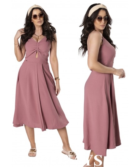 Gładka sukienka z dekoltem w serek i ciekawym wycięciem na linii biustu.