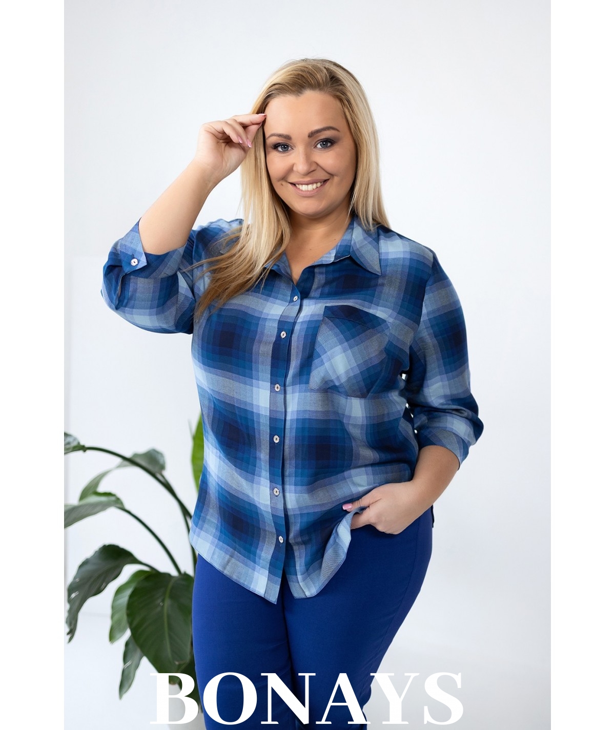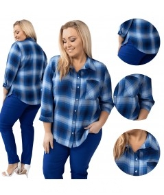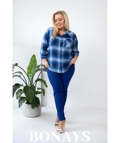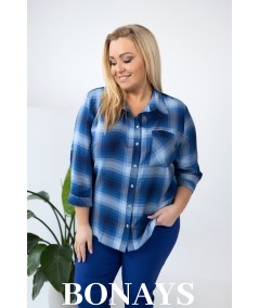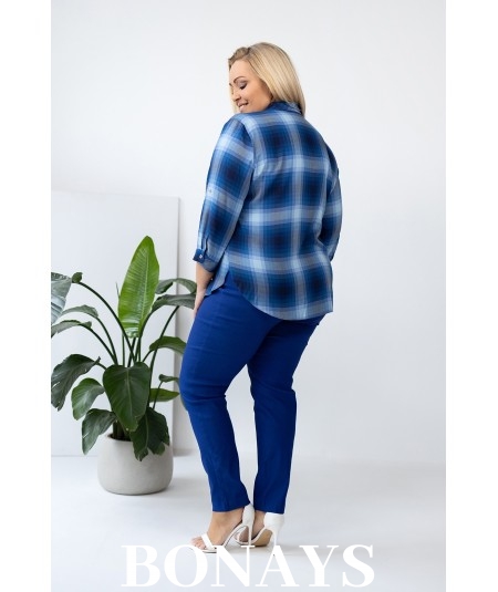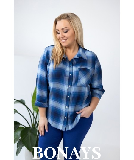 Niebieska Koszula w kratę rękaw 3/4 i zapinanie na guziki Plus Size