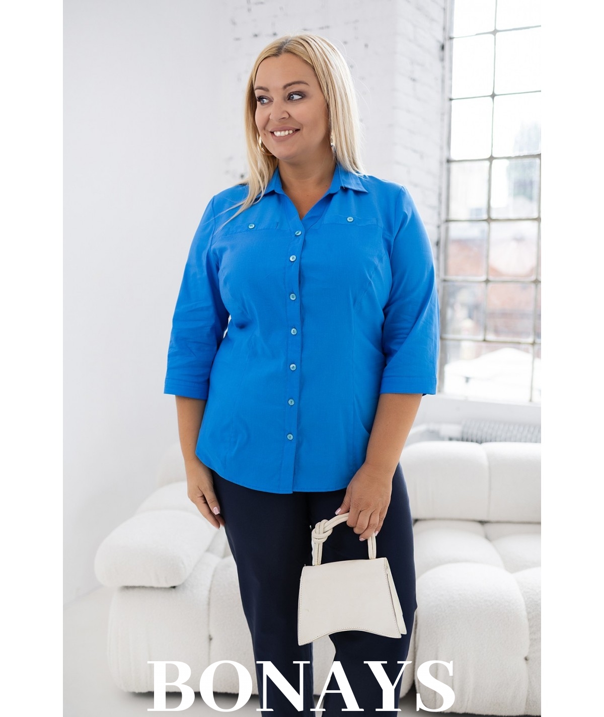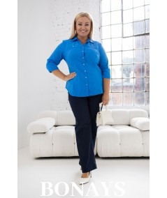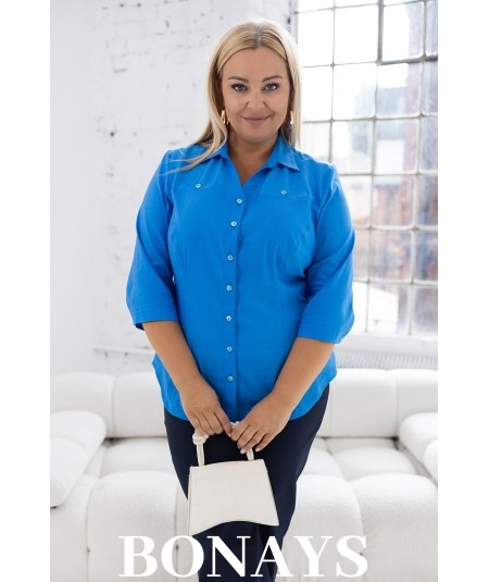 Klasyczna turkusowa koszula damska o taliowanym fasonie. Koszula w kolorze niebieskim doskonale nadająca się do pracy w biurze, banku oraz do eleganckich stylizacji. Nien\bieska koszula w rozmiarach plus size idealnie wyszczuplająca optycznie sylwetkę i zbierająca nadprogramowe kilogramy tak, że sprawia iż masz mniejszy rozmiar optycznie na sobie. Koszula idealnie komponuje się ze spódnicami ołówkowymi i eleganckimi spodniami.