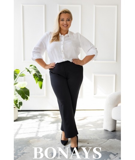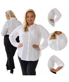 Ten model jest idealny dla kobiet plus size, które szukają eleganckiej, ale i komfortowej odzieży na co dzień i na specjalne okazje. Modelka o wzroście 176 cm prezentuje koszulę w rozmiarze 50.